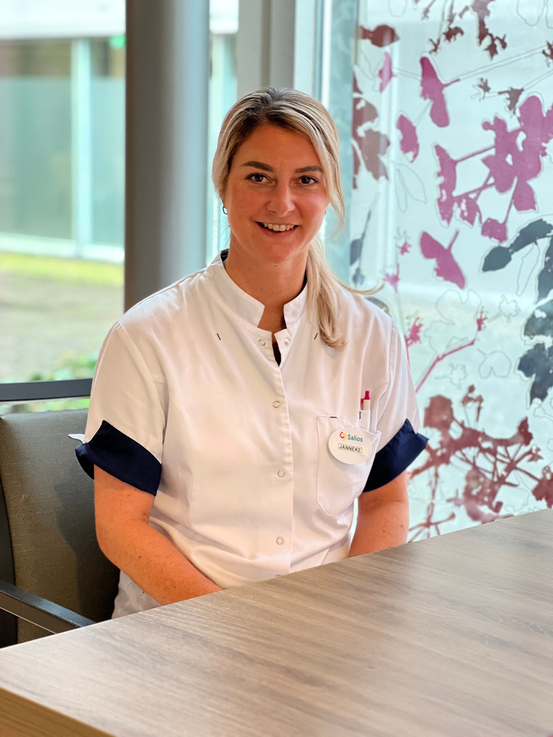 Of Janneke het naar haar zin heeft bij Salios locatie Swinhove? Dat kan bijna niet anders. Janneke (37) werkt inmiddels meer dan haar halve leven bij Swinhove, onderdeel van Salios. Als 16-jarig meisje liep zij stage als Verzorgende IG (VIG’er) om het verpleeghuis vervolgens nooit meer te verlaten. Inmiddels is zij Geriatrische Revalidatie Verzorgende op de revalidatieafdeling.